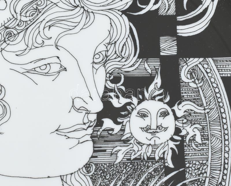 Leírás: Hollóházi Szász Endre által tervezett dekorral díszített porcelán tányér. Matricás, jelzett, minimális kopással, d: 31 cm