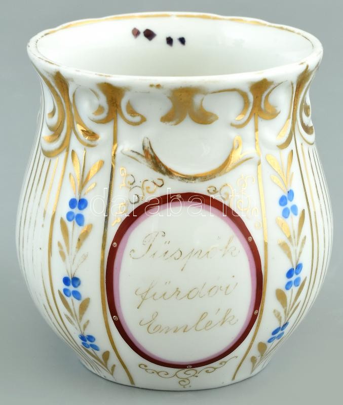 Leírás: Püspökfürdői porcelán emlékbögre, kézzel festett, jelzés nélkül, kopottas, m: 9 cm