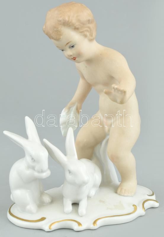 Leírás: Wallendorf nyuszikat etető puttó, kézzel festett, jelzett, hibátlan, m:15 cm
