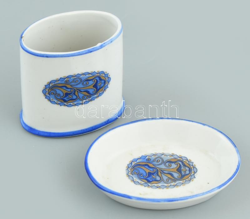 Leírás: Zsolnay fogpiszkáló-/gyufatartó és tálka. Részben kézzel festett, jelzett, kis kopásnyomokkal, m: 5,5 cm, 7x5 cm