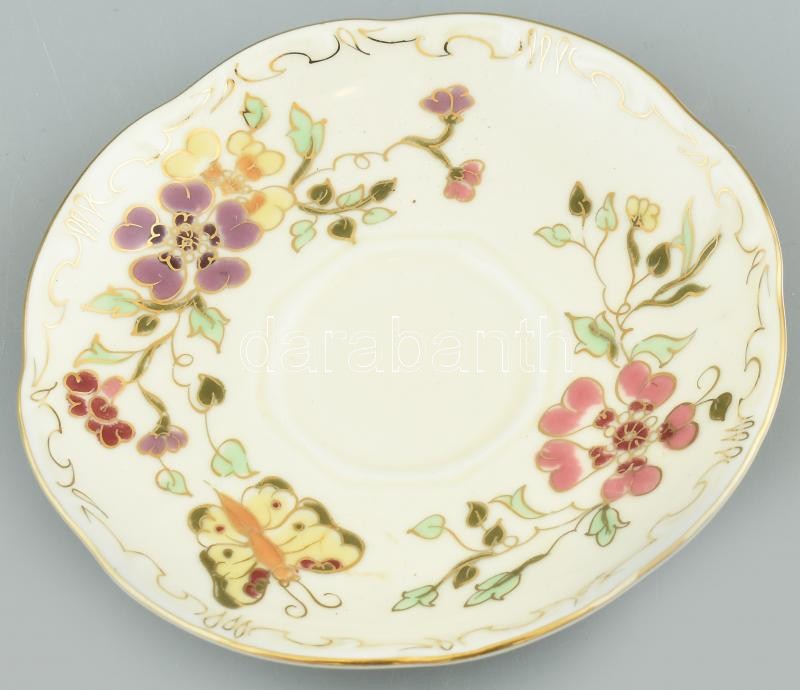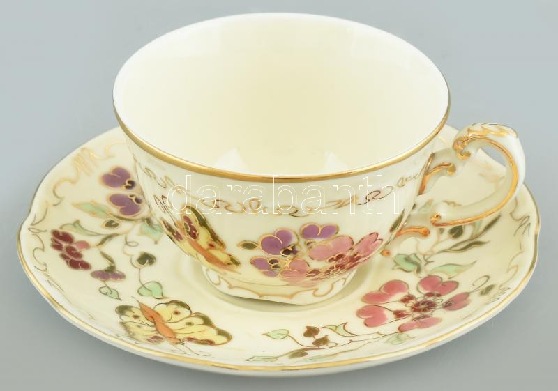 Leírás: Zsolnay pillangó mintás mokkás csésze és alj, kézzel festett, enyhén kopott aranyozás, jelzett.