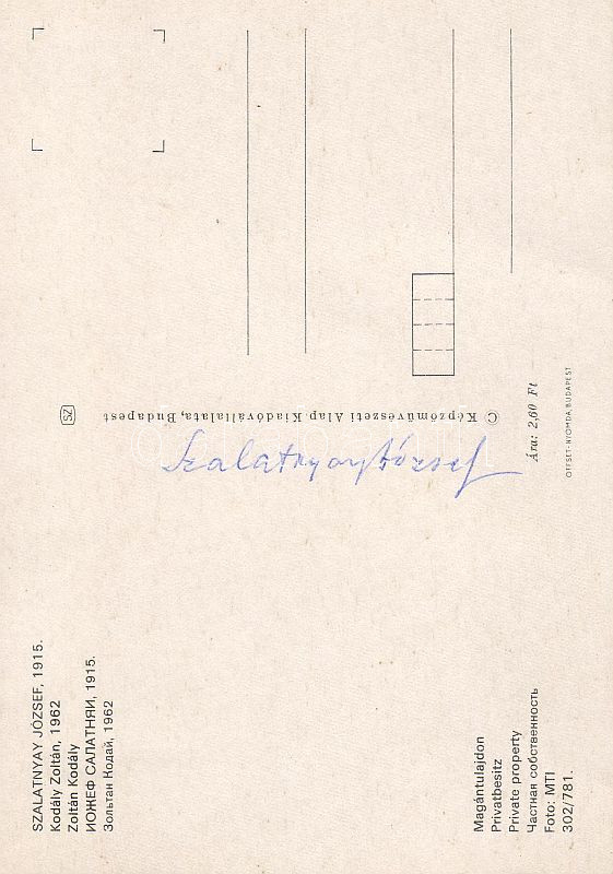 Leírás: 1983. Szalatnyai József festőművész sajátkezű aláírása az által készített Kodály-porté-képeslap hátoldalán