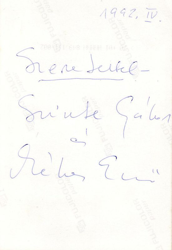 Leírás: 1992. Szinte Gábor festőművész sajátkezű aláírása az általa készített Krisztus képről készült fotó hátoldalán