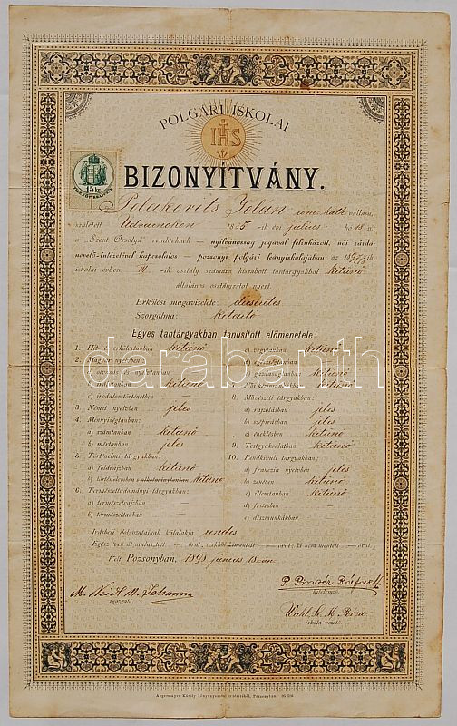 1897/98 Polgári iskolai bizonyítvány Pozsony https://www.darabanth.com/hu/41-Gyorsarveres/41.0/Festmeny-mutargy-papirregiseg-egyeb/Okmanyok~146/189798-Polgari-iskolai-bizonyitvany-Pozsony~II79893
