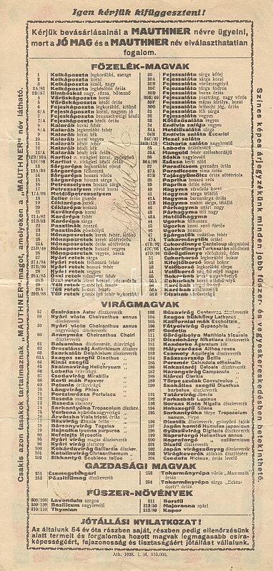1928 Mauthner naptás Hátoldalán magvak listája https://www.darabanth.com/hu/41-Gyorsarveres/41.0/Festmeny-mutargy-papirregiseg-egyeb/Reklam-Advertising~170/1928-Mauthner-naptas-Hatoldalan-magvak-listaja~II79889