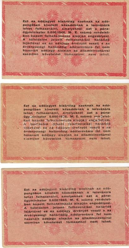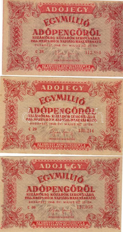 Leírás: 1946. 1000.000Adóp. (3x) 6 jegyű sorszámmal ,, hátlapi fordított címerrel, benne vágási rendellenességgek T:II