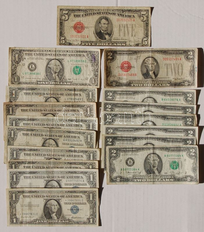 USA 1928-1988. 1$ (9x), 2$ (7x), 5$ (1x) T:II,III,IV https://www.darabanth.com/hu/41-Gyorsarveres/41.0/Numizmatika/Magyar-es-kulfoldi-bankjegyek~153/USA-1928-1988-1USD-9x-2USD-7x-5USD-1x-TII-III-IV~II78496