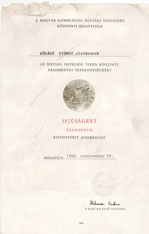 Leírás: 1988. "Ifjúságért" érdemérem adományozó oklevél (beszakdva) piros műanyag mappában KISZKB első titkára s.k. aláírásával