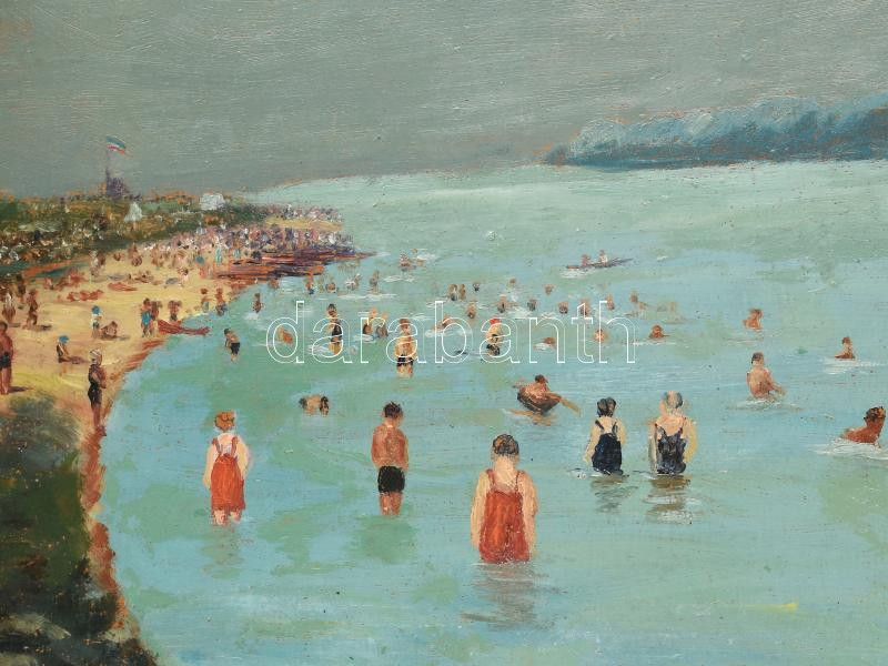 Korda Vince (1897-1979): Rómaifürdő, 1920-as évek. Olaj, karton, sérült. Kelezve jobbra lent. Dekoratív, sérült fakeretben. 49x67 cm. / oil on board, signed, damaged