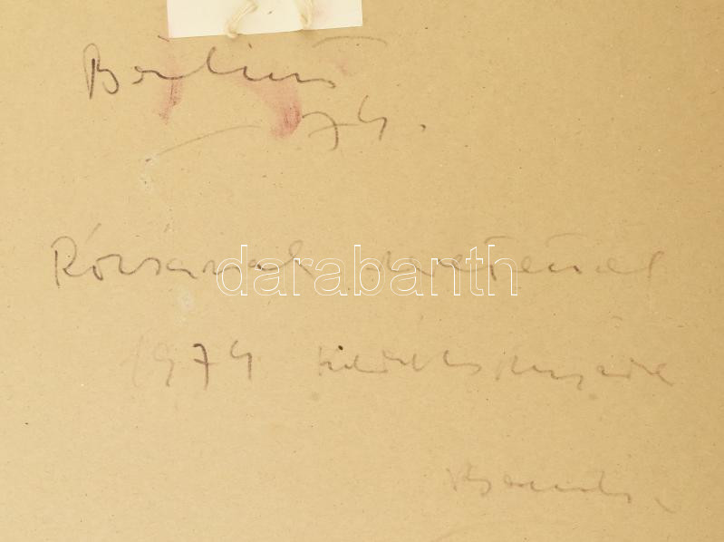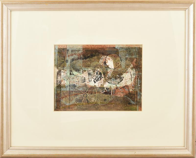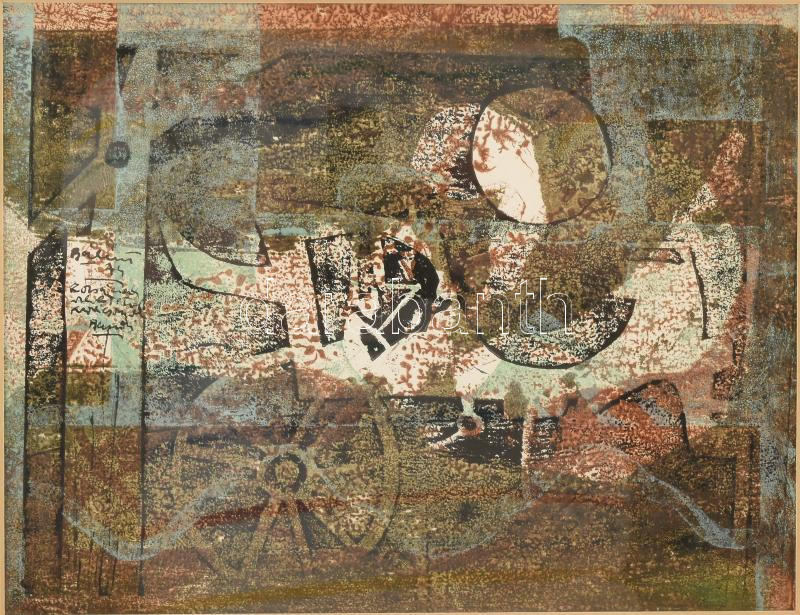Bálint Endre (1914-1986): Cím nélkül, 1974. Monotípia, papír. Jelzett. Hátoldalán Bálint Endre autográf ajándékozási soraival Polgár Rózsa (1936-2014) Kossuth-díjas magyar textilművész részére, 1974 karácsonyán. Proveniencia: Polgár Rózsa hagyatékából. 19x25 cm Üvegezett keretben. / monotype on paper, signed, with the artist Endre (André) Bálint's autograph dedication on the reverse. framed