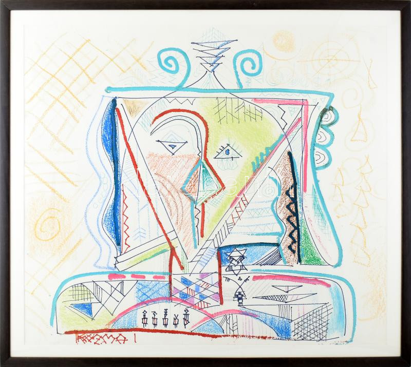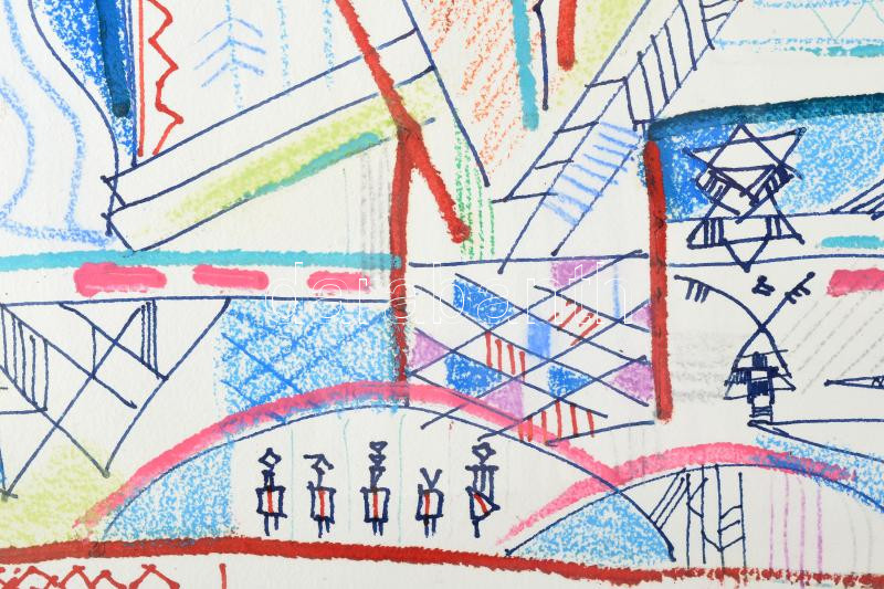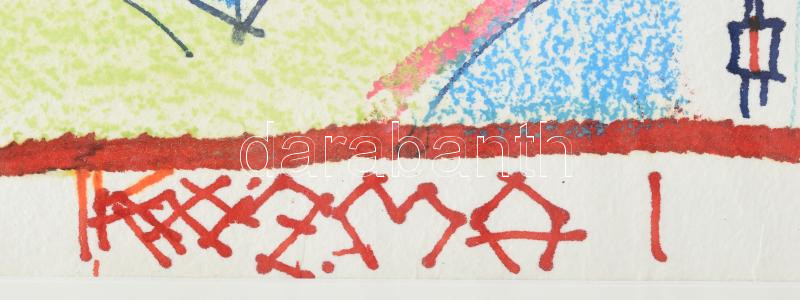 Leírás: Kozma István (1937-2020): Kompozíció. Vegyes technika, papír. Jelzett. Üvegezett keretben. 72x82 cm / mixed technique on paper, signed, framed.