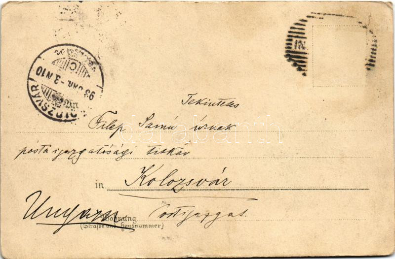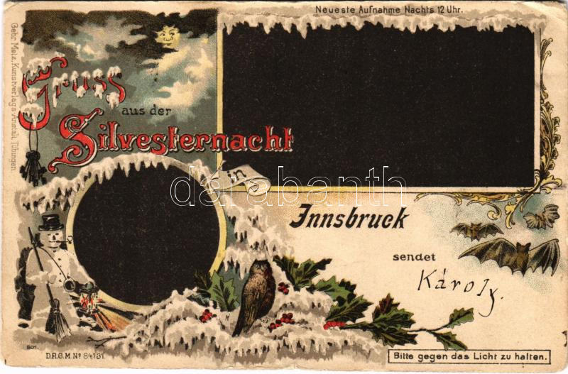 1893 (Vorläufer) Innsbruck, Gruss aus der Silvesternacht, Neueste Aufnahme Nachts 12 Uhr. Bitte gegen das Licht zu halten, Gebr. Metz / New Year's Eve greeting, winter. Art Nouveau hold to light litho (EK)