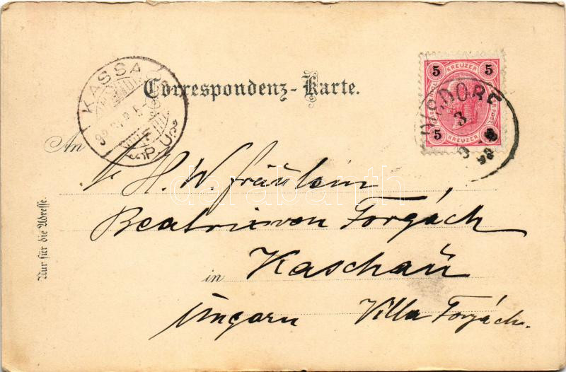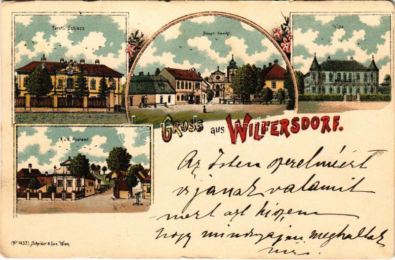 Leírás: 1898 (Vorläufer) Wilfersdorf, Fürst. Schloss, Haupt Ansicht, Villa, K.u.k. Postamt / castle, villa, post office. Scheinder& Lux Art Nouveau, floral, litho (small tears)