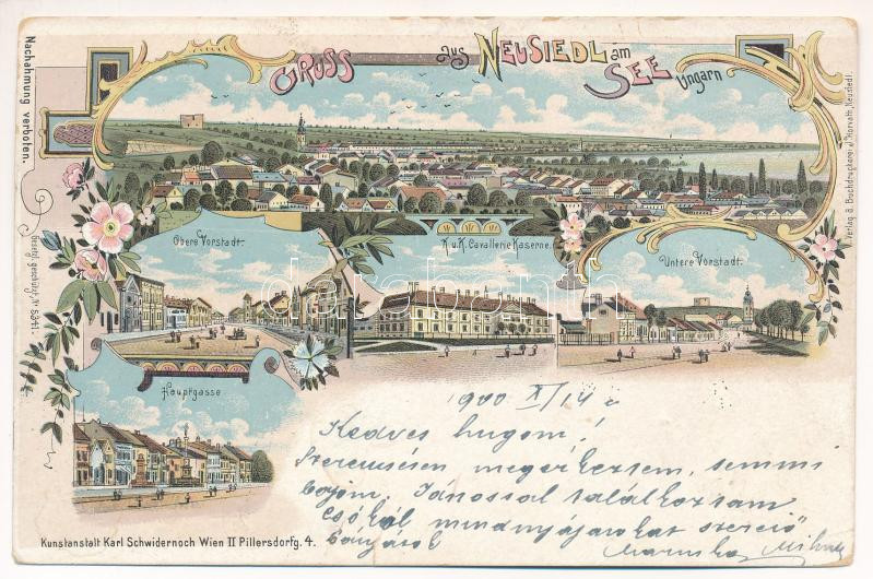 1900 Nezsider, Neusiedl am See; Obere und Untere Vorstadt, Hauptgasse, K.u.k. Cavallerie Kaserne / Alsó és Felső Előváros, Fő utca, Cs. és kir. lovassági laktanya / main street, cavalry barracks. Kunstanstalt Karl Schwidernoch Art Nouveau, floral, litho (szakadások / tears)
