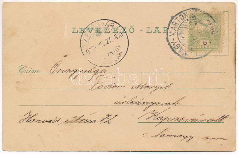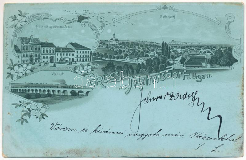 1905 Nagymarton, Mattersdorf, Mattersburg; Platz mit Sparkassa und Schule, Viaduct / Fő tér, Takarékpénztár, iskola, vasúti viadukt, gőzmozdony, vonat / main square, savings bank, school, railway viaduct, train, locomotive. Art Nouveau, floral, litho (fl)