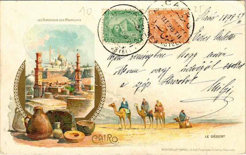 Leírás: 1898 (Vorläufer) Cairo, Le Désert, Les Tombeaux des Mameluks / desert, mausoleum. Richter & Co. Art Nouveau, litho, TCV (EK)