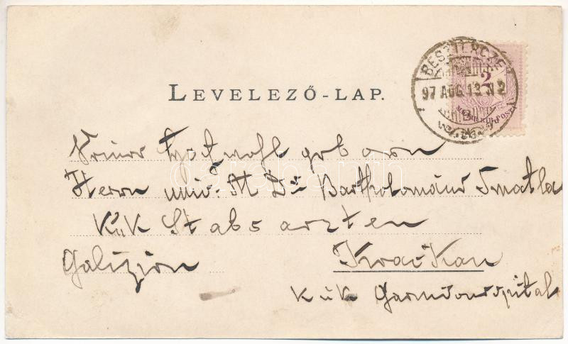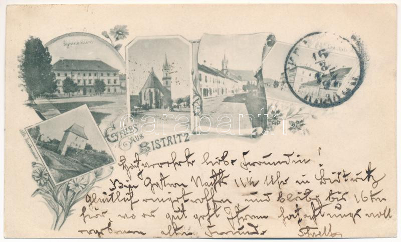 1897 (Vorläufer) Beszterce, Bistritz, Bistrita; Gimnázium, templom, utca, régi várfal / Gymansium, Alte Stadtmauer, Kirche / grammar school, church, street, old city wall. Art Nouveau, floral (EK)