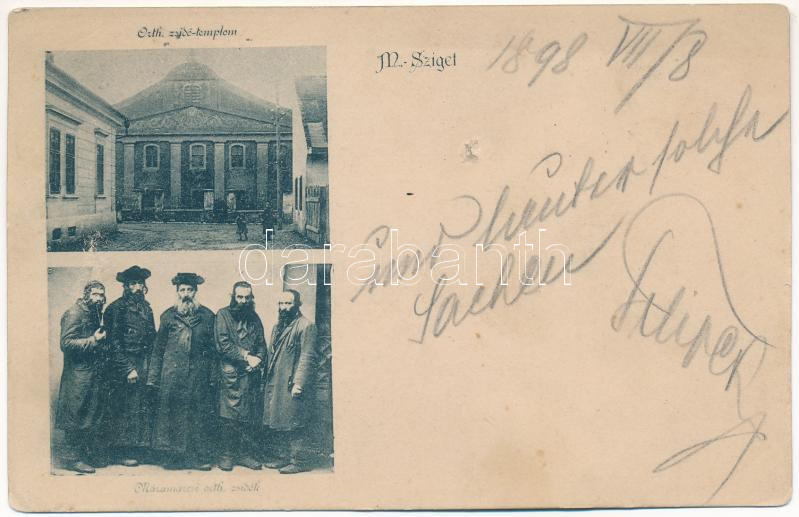 Leírás: 1898 (Vorläufer) Máramarossziget, Sighetu Marmatiei; Ortodox zsidó templom, zsinagóga, zsidók. Judaika / Orthodox synagogue, Jewish men. Judaica (lyuk / hole)