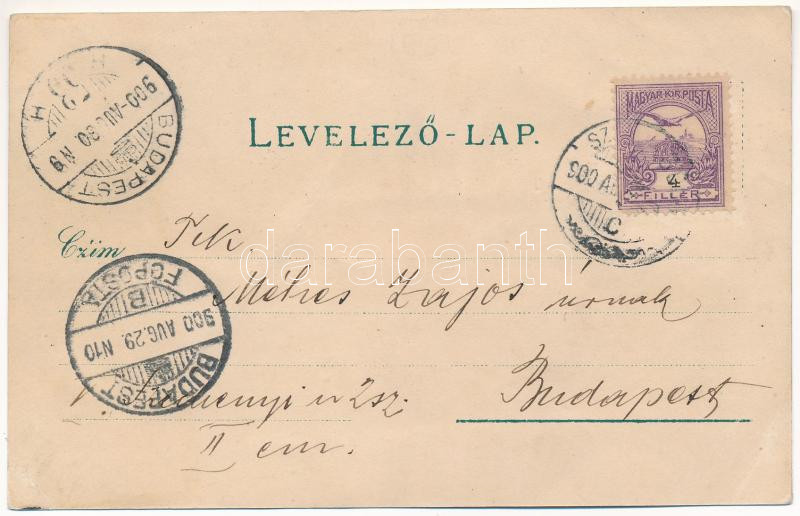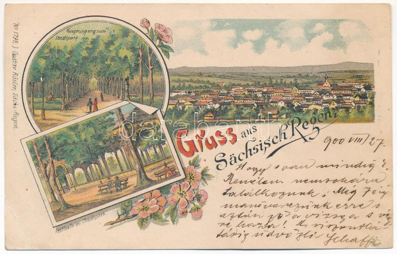 1900 Szászrégen, Reghin; Haupteingang zum Stadtpark, Festhalle. Gustav Rösler No. 1798. / főbejárat a parkba, csarnok / main entry to the park, hall. Art Nouveau, floral, litho (EK)