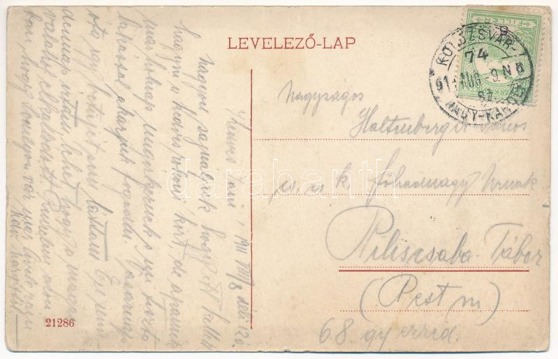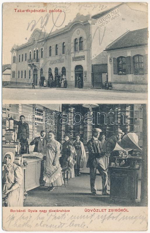 1911 Zsibó, Jibou; Takarékpénztári palota, Fehér György cipész, Borbandi Gyula nagy divat áruházának belseje / savings bank, shop interior + "KOLOZSVÁR-NAGYKÁROLY 74. SZ." vasúti mozgóposta (kis szakadás / small tear)