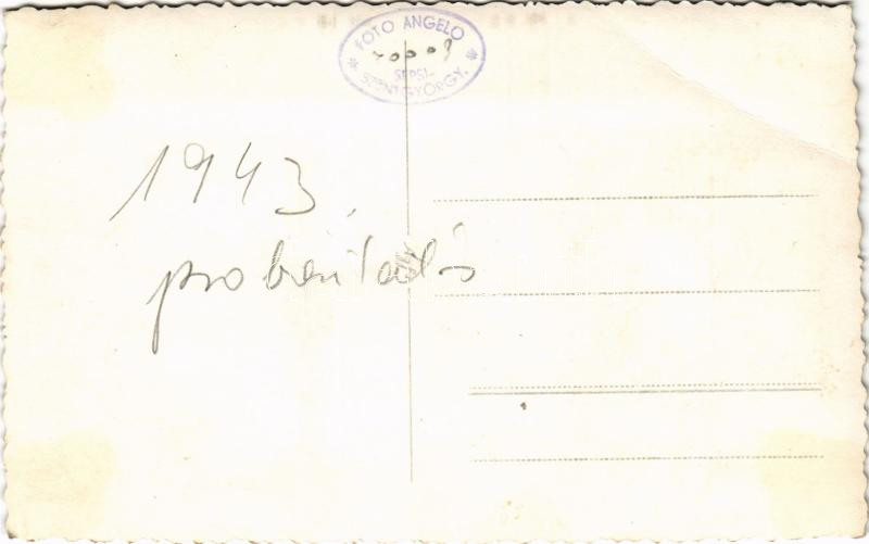1943 Sepsiszentgyörgy, Sfantu Gheorghe; Országzászló magyar címerrel, katonák csoportképe / Hungarian flag and monument, coat of arms, soldiers. Foto Angelo photo (EB)