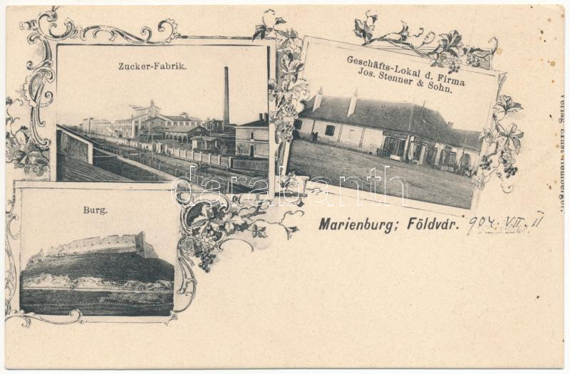 Barcaföldvár, Földvár, Marienburg, Feldioara; Zucker Fabrik, Burg, Geschäfts-Lokal d. Firma Jos. Stenner & Sohn / Cukorgyár, Josef Stenner és fia üzlete, vár / sugar factory, shop, castle. Art Nouveau, floral (EK)