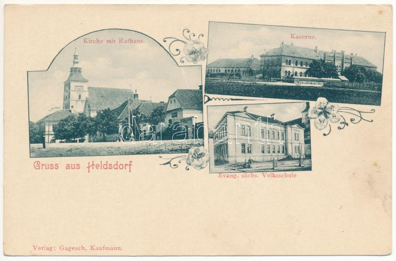 Höltövény, Heldsdorf, Halchiu; Kirche mit Rathaus, Kaserne, Evang. sächs. Volksschule / Templom és városháza, laktanya, evangélikus szász iskola. Gagesch Kaufman / church and town hall, military barracks, Lutheran Saxon school. Art Nouveau, floral