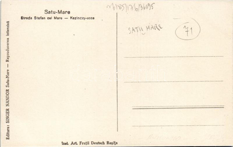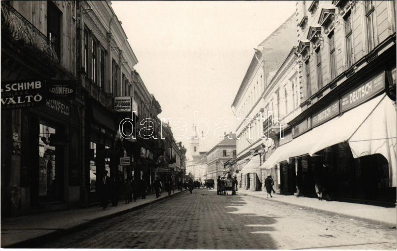 Szatmárnémeti, Satu Mare; Kazinczy utca, Dr. Fodor fogorvos, Deutsch üzlete, Grünfeld cipőüzlet, Kereskedelmi bank rt. pénzváltó, E. Bródy üzlete. Singer Nándor kiadása / Strada Stefan cel Mare / street, dentist, shops
