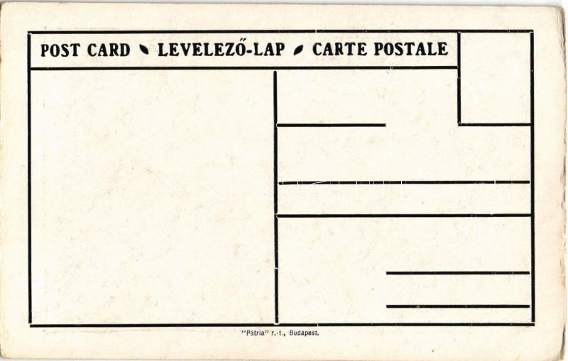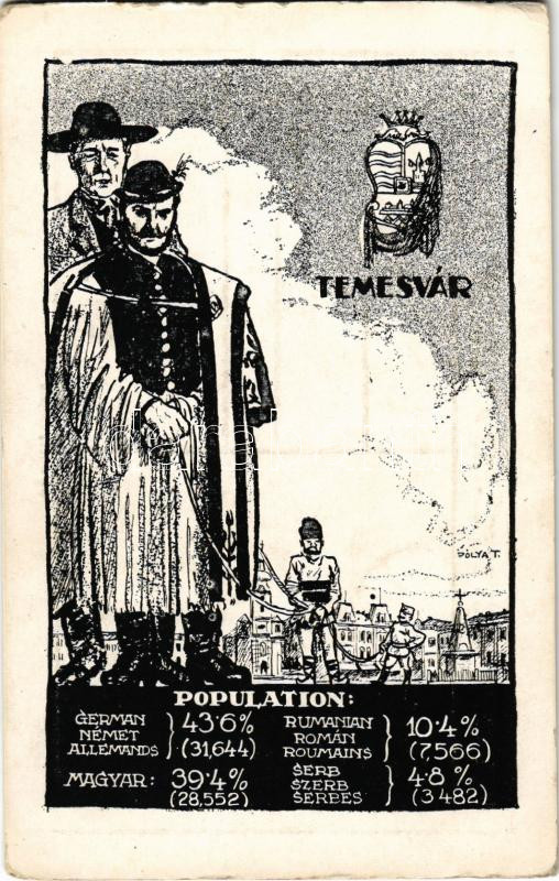 Temesvár, Timisoara; Magyar, német,román (oláh) és szerb nemzetiségek népesség aránya. Címer, Pátria rt. kiadása / Percentage of Hungarian, German, Romanian and Serbian population. Irredenta art postcad with coat of arms s: Pólya Tibor (EK)