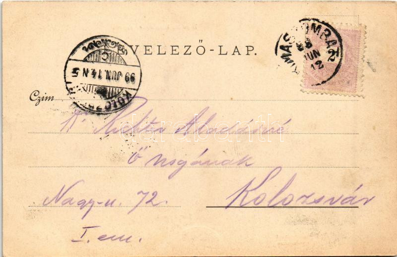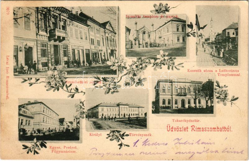 1899 (Vorläufer) Rimaszombat, Rimavská Sobota; Erzsébet tér, Egyes. Protest. főgimnázium, Királyi törvényszék, takarékpénztár, Kossuth utca, Lutheránus templom, Izraelita templom és paplak, zsinagóga, Krausz Sándor üzlete / synagogue, Jewish rectory, school, court, street, savings bank, square. Art Nouveau, floral