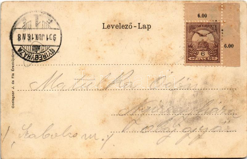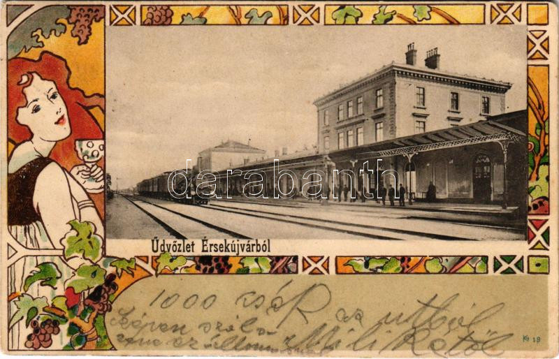 1901 Érsekújvár, Nové Zámky; vasútállomás, gőzmozdony, vonat. Conlegner J. és fia kiadása / railway station, train, locomotive. Art Nouveau, litho (fl)