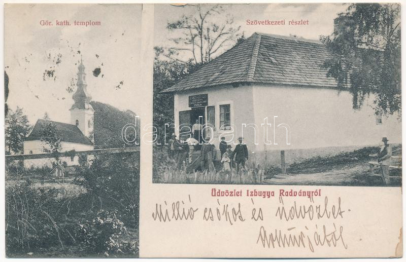 Leírás: 1911 Izbugyaradvány, Vysna Radvan (Laborcradvány, Radvan nad Laborcom); Görög katolikus templom, szövetkezeti üzlet / Greek Catholic church, cooperative shop (fl)