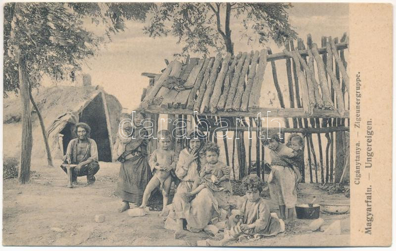 Leírás: Magyarfalu, Magyarfalva, Ungeraiden, Ungereigen, Uhorská Ves, Záhorská Ves; Cigány tanya. Wiesner Alfréd kiadása / Zigeunergruppe / gypsy camp
