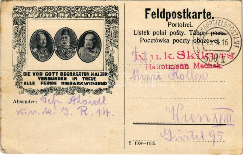 1916 Első világháborús tábori postai levelezőlap a Központi Hatalmak uralkodóival: V. Mehmed, II. Vilmos, I. Ferenc József / WWI Austro-Hungarian K.u.K. military field postcard, Viribus Unitis and Central Powers propaganda: Mehmed V, Wilhelm II, Franz Joseph I of Austria. Portofrei Feldpostkarte (EK) + "K.u.k. SKIKURS Hauptmann Machek"