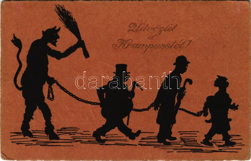 1932 Üdvözlet a Krampusztól! / Krampus with birch, silhouette (EK) https://www.darabanth.com/hu/41-Nagyaukcio/41.1/Kepeslapok/Krampusz~16983/1932-Udvozlet-a-Krampusztol-Krampus-with-birch-silhouette-EK~II3008378