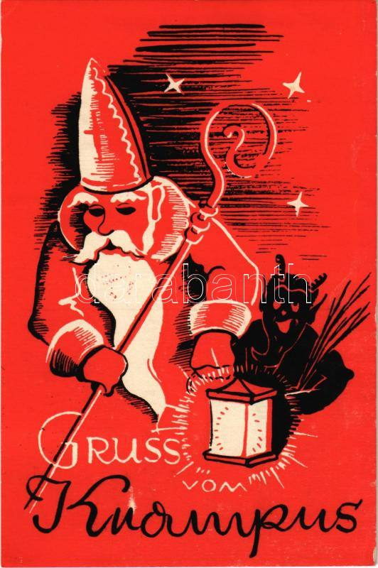 1947 Gruss vom Krampus with Saint Nicholas / Krampusz és Mikulás (EK) https://www.darabanth.com/hu/41-Nagyaukcio/41.1/Kepeslapok/Krampusz~16983/1947-Gruss-vom-Krampus-with-Saint-Nicholas-Krampusz-es-Mikulas-EK~II3008648