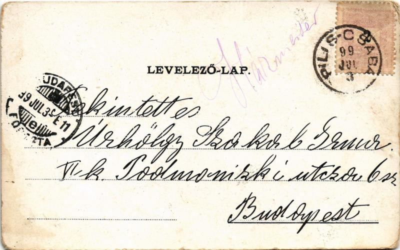 Leírás: 1899 (Vorläufer) Piliscsaba, Pilis Csaba; tábori vasútállomás, gőzmozdony, vonat, Templom tér. Blau Albert Art Nouveau, floral, litho (EK)