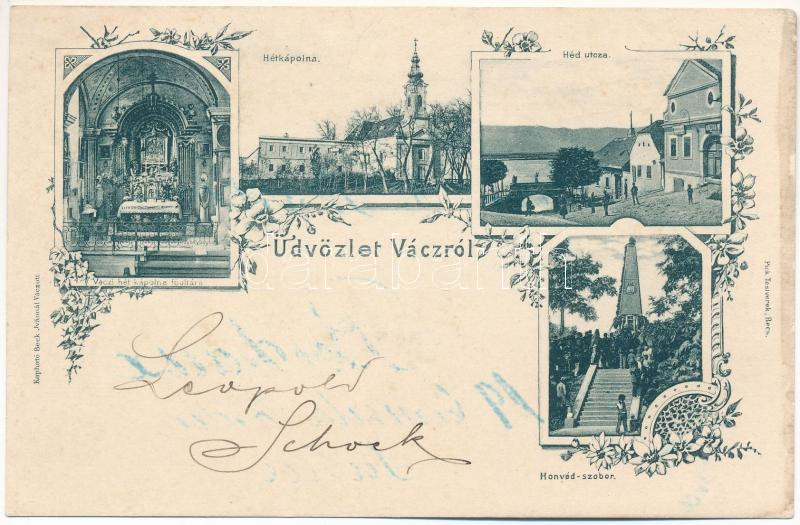 Leírás: 1899 (Vorläufer) Vác, Hétkápolna, belső főoltárral, Híd utca, Honvéd szobor, emlékmű. Beck Iván kiadása. Art Nouveau, floral (ázott / wet damage)