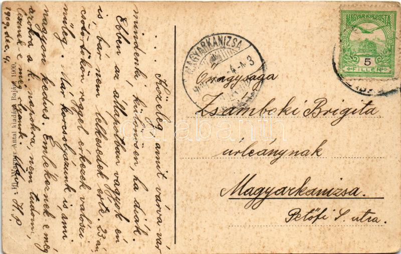 Leírás: 1909 Baja, Erzsébet királyné utca, Klein Rezső áruháza, Reich Farkas fia üzlete, Kőbányai kőraktér és bútor raktár. Ifj. Wagner Antal kiadása (EK)