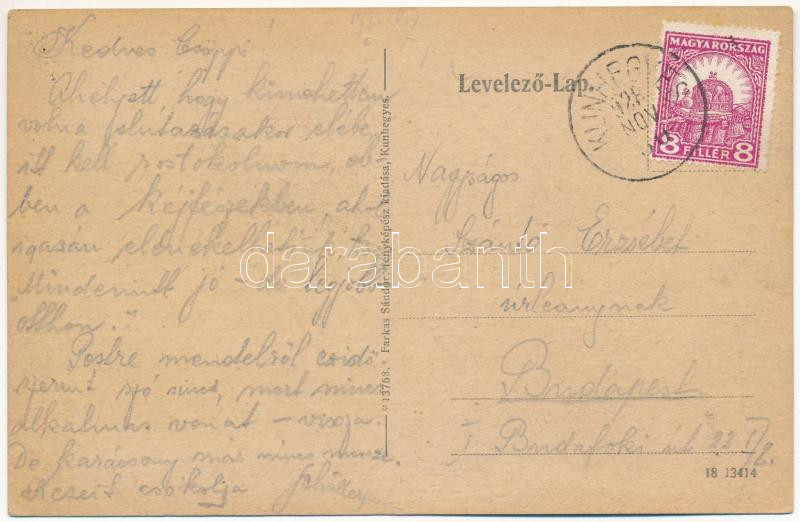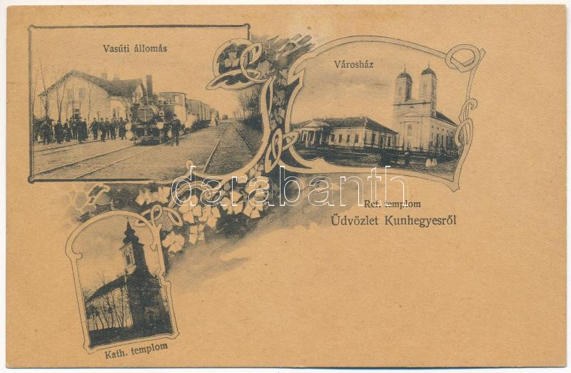 1928 Kunhegyes, vasútállomás, gőzmozdony, vonat, vasutasok, Városháza, Református templom, Római katolikus templom. Farkas Sándor fényképész kiadása. Art Nouveau, floral (EK)