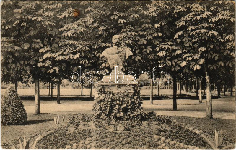 Leírás: Budapest II. Lipótmező, Hidegkúti út, Cs. és Kir. gyalogsági hadapród iskola, részlet a növendékek kertjéből Ferenc József szoborral (fl)