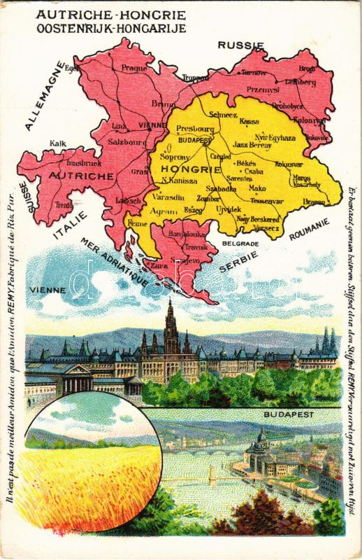 Budapest és Bécs. Osztrák-Magyar Monarchia térképe / Budapest and Wien (Vienna). Autriche-Hongrie. Remy belga reklám és kiadása, Art Nouveau, litho (EK)