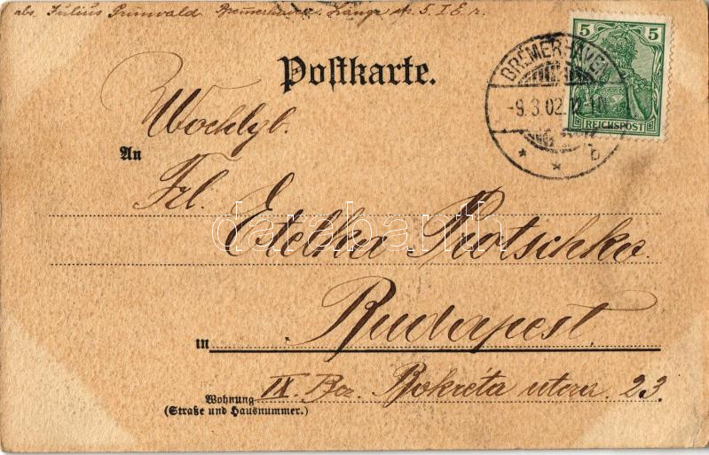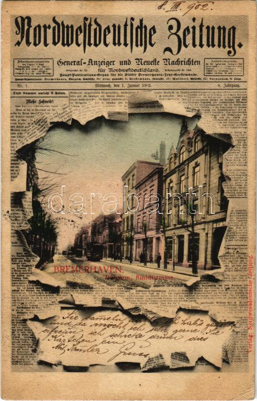 Leírás: 1902 Bremerhaven, Bürgerm. Smidtstrasse, Nordwestdeutsche Zeitung / street, newspaper montage. Art Nouveau (EK)