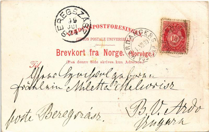 Leírás: 1899 (Vorläufer) Hardanger, Brud, kone / Norwegian flag and folklore: bride and wife.Art Nouveau, floral (wet damage)