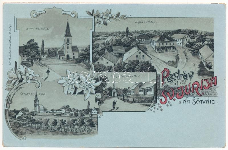 Leírás: Sveti Jurij ob Scavnici, Cerkev sv. Duha, Pogled na Videm, Marijina Kapela na Vidmi / churches, chapel. Th. Böhm Art Nouveau, floral, litho (EK)