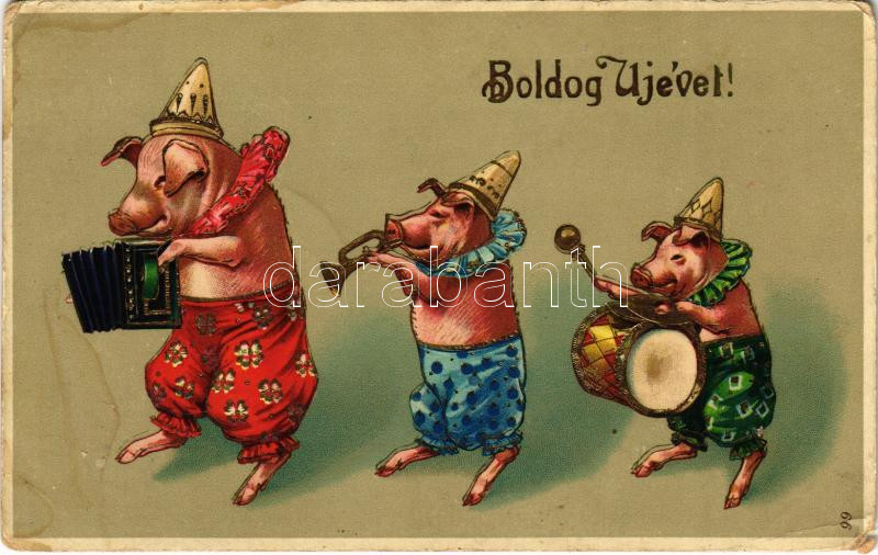 Boldog új évet! Malac banda / New Year greeting, pig music band. litho... https://www.darabanth.com/hu/41-Nagyaukcio/41.1/Kepeslapok/Udvozlolapok-Unnepek~16997/Boldog-uj-evet-Malac-banda-New-Year-greeting-pig-music-band-litho-EM~II3008604