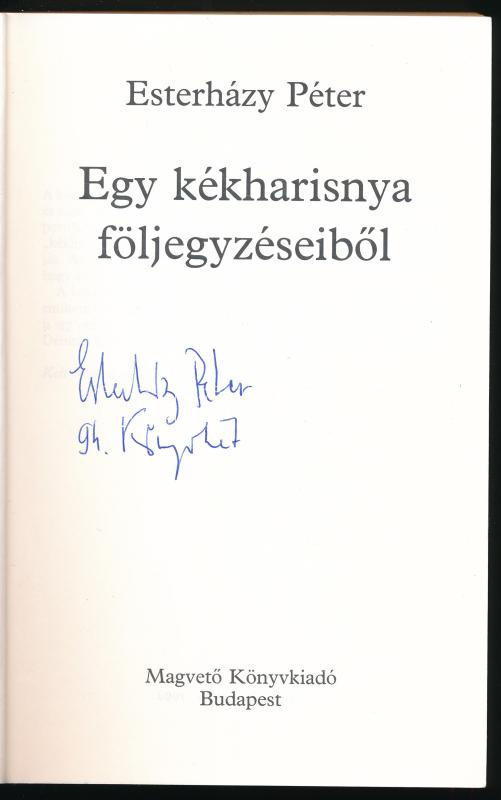Esterházy Péter: Egy kék harisnya följegyzéseiből. A szerző, Esterházy Péter (1950-2016) író által ALÁÍRT példány. Első kiadás. Bp.,1994,Magvető. Kiadói papírkötés.