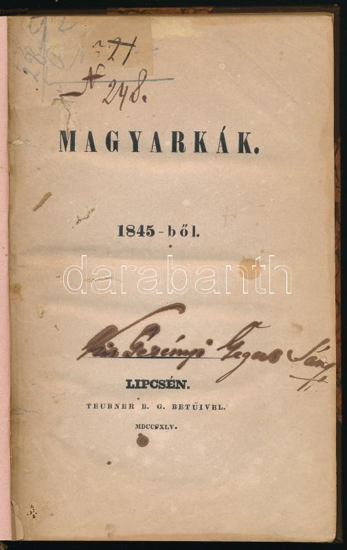 Kovacsóyzky Mihály - Császár Ferenc): Magyarkák 1845-ből Lipcsén, 1845. Teubner B. G. IV. 236 p. Restaurált félvászon kötésben. A kötet utolsó oldalán foltos. ,,Talárikák, Kosmikák, Pepedeumenikák. Ez utolsóban a korszak jeles személyiségeiről ír kritikus, sokszor gúnyos hangnemben Czuczor Gergely, Fáy András, Fényes Elek, Garay János, Irinyi József, Kossuth Lajos, Nagy Ignácz, Petőfy(!) Sándor, Gr. Széchenyi István, Vörösmarty Mihály és sokan másokról.