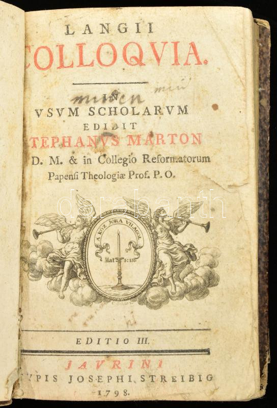 Márton, Stephanus [István]: Langii Colloquia. In usum scholarum. Editio III. Jaurini [Győr], 1798, Typis Josephi Streibig, LXXX+318 p. (Tartalma: A nyelvek' tanításáról. Deák Grammatika. Deák-magyar-német szótár.) Korabeli kartonált papírkötésben, kissé viseltes, sérült borítóval, helyenként kissé sérült, foltos lapokkal, az előzéklapon tulajdonosi névbejegyzéssel (Veres Sámuel).