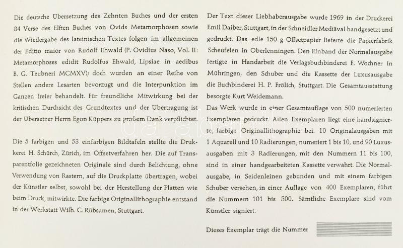 Ovid: Metamorphosen. Buch X. Mythen um Orpheus. Illustriert von Manfed Henninger. Übersetzt von Ernst Zinn. Mit einer Einleitung von Karl Kerényi. [Publius Ovidius Naso: Metamorphoses. (Átváltozások). X. könyv. Kerényi Károly bevezetőjével. DEDIKÁLT!]. Heidenheim, 1969, Erich Hoffmann, XVII+(1)+37+(3) p. Német nyelven. Kiadói papírkötés, a borító kissé foltos, belül jó a lapok állapotban. Megjelent 500 számozott példányban. Számozatlan, Kerényi Károly (1897-1973) klasszika-filológus, vallástörténész által lánya, Kerényi Grácia (1925-1985) költő részére DEDIKÁLT példány!